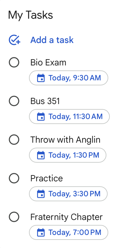 This schedule was created by a DIII baseball player for his typical Monday. Exams, classes, practice, and social events all occur on the same day, showing that the lack of free time forces athletes to manage their time better, such as making daily schedule. The stress comes from never having enough time to balance everything at once.