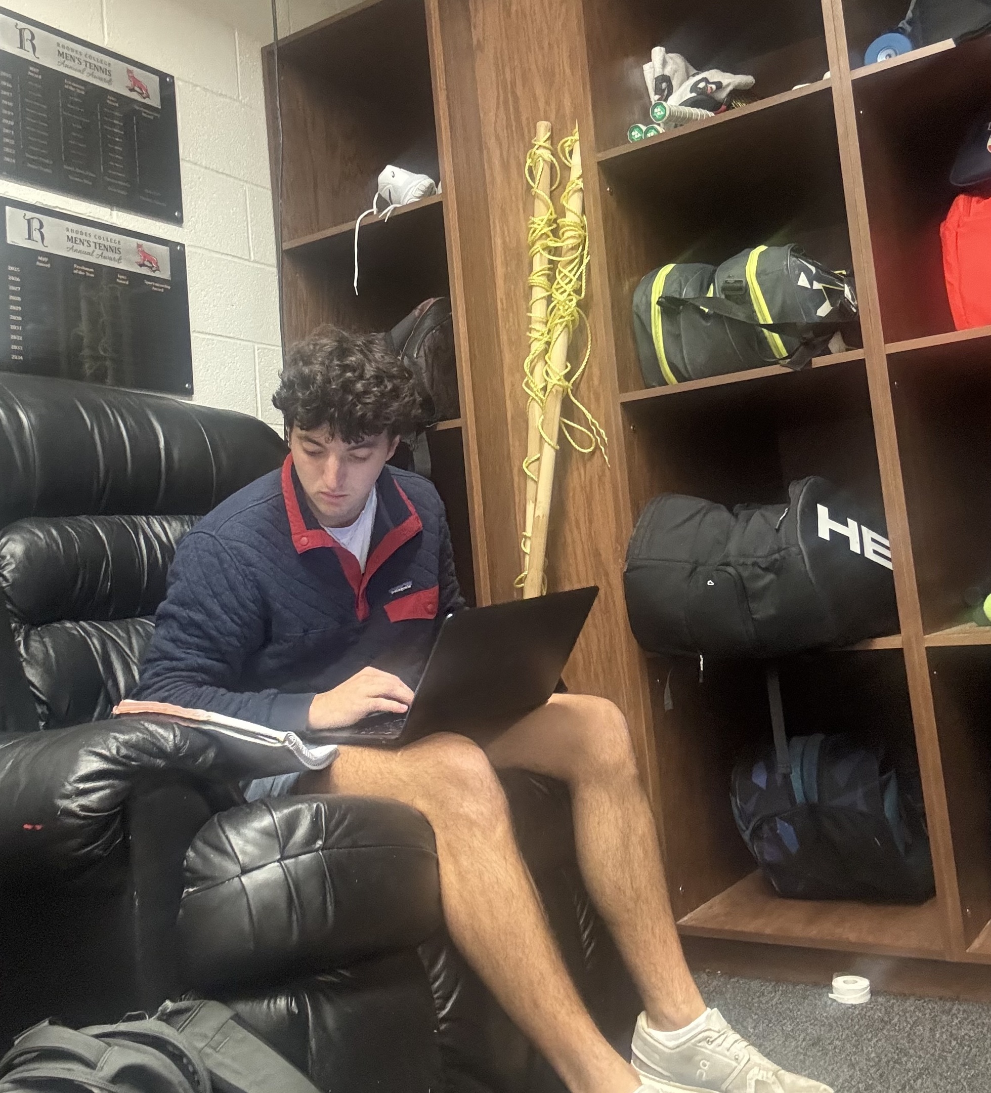 An athlete sitting in the corner of the locker room, trying to get school work done before practice alongside all his gear. This image shows how success in academics requires creating time in the margins of your day, proving the constant stress DIII student athletes face with managing their schedule.